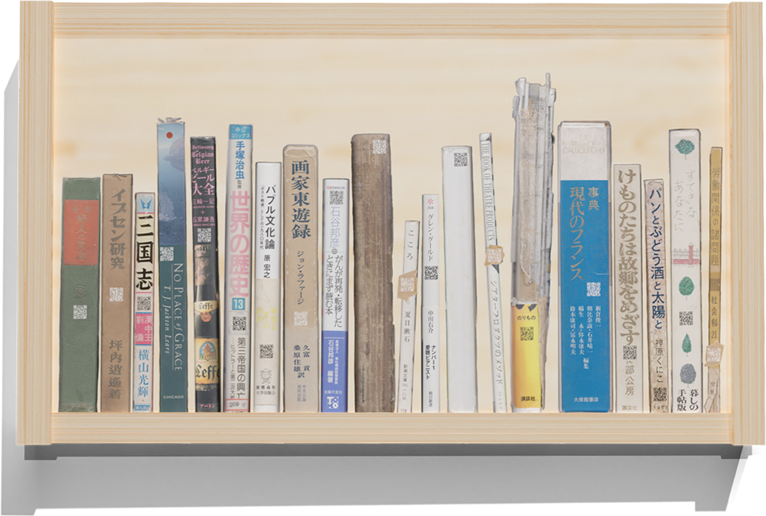 日本では長く使った道具を供養するために、人々が塚や墓を作る慣習があり、作者はこれにインスピレーションを得て本作を制作しました。古本屋でも沢山のメモや書き込みがされた「余白本」は引き取られることなく、いずれその生涯を終えます。持ち主もバラバラな、様々な人生に関わった本たちが、一つの家族の本棚のように、隣通しで並びます。二次元コードを読み取るスマートフォンは、現代人にとってプライベート空間ということもできます。情報化社会では、似た意見が目に入りやすく、他者に対して不寛容になりがちだと言われます。バーチャル本棚は、各々のプライベートな空間に他者を招き、本を通して様々な他者を想像することを促しているのです。